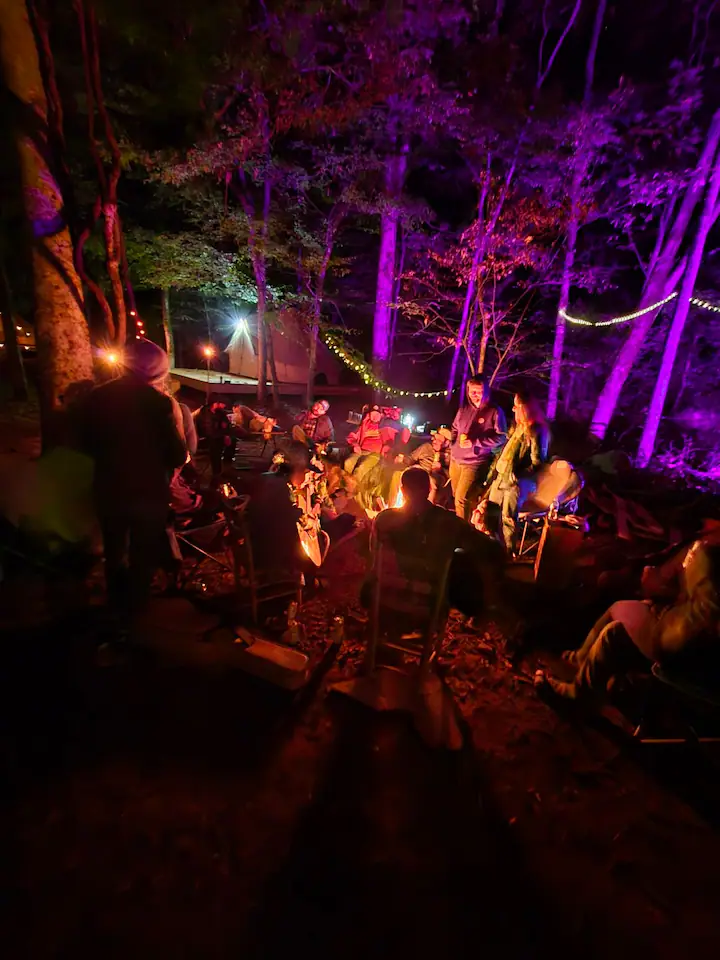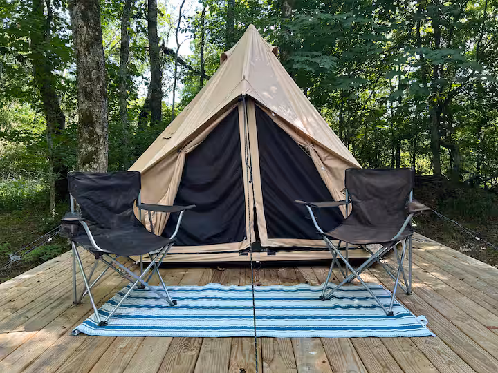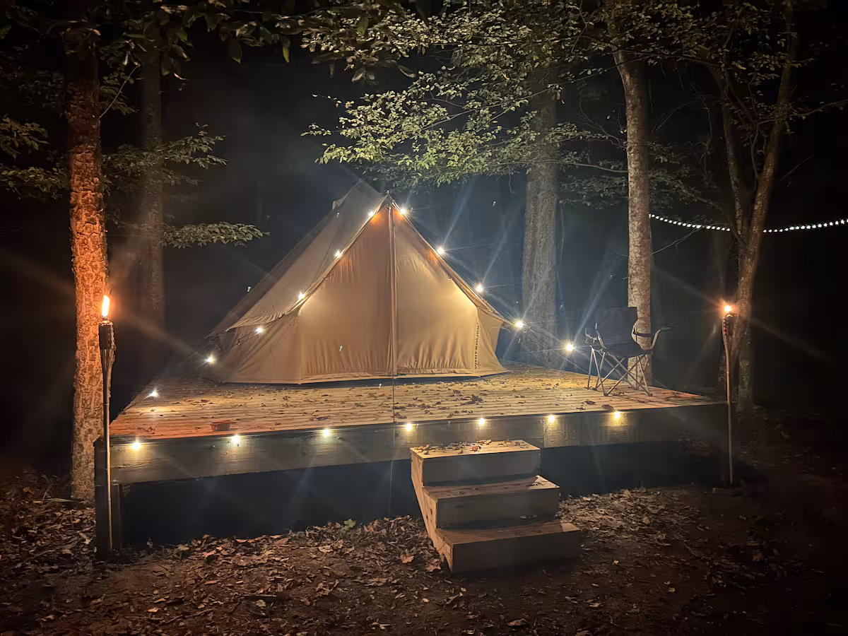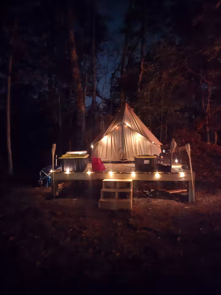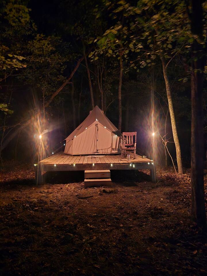 Each site features a raised platform, a cozy pre-pitched canvas bell tent, squishy air mattresses, fire pits for your marshmallow rituals, and string lights to keep the vibes glowing. Just bring your gear, your good energy, and maybe your favorite camping mug.
