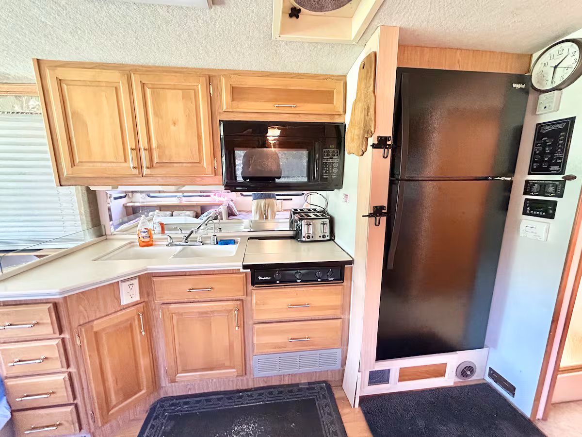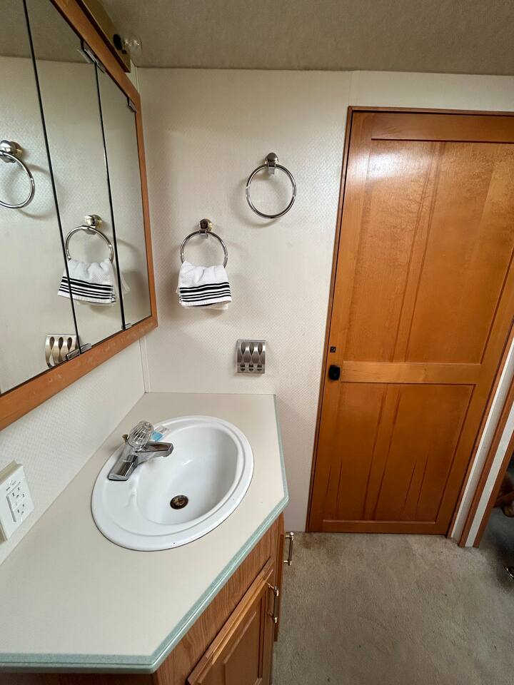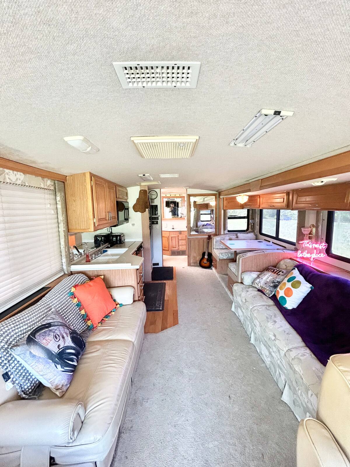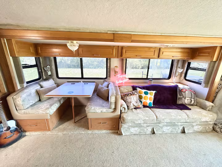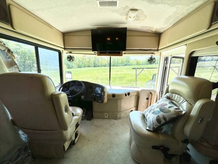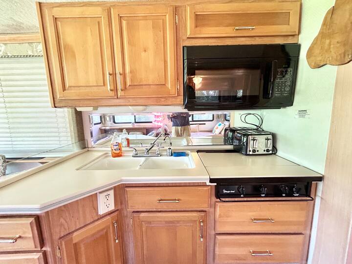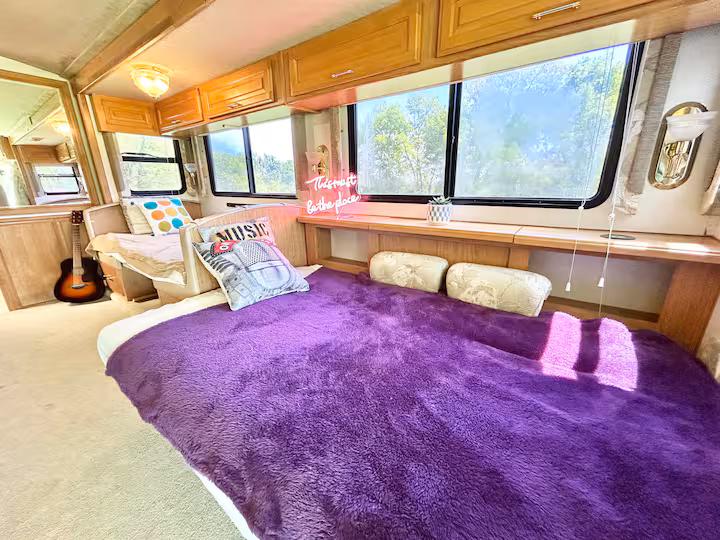 Roads? Where we're going we don't need roads. This 38 ft RV overlooks a see of green, and is a stylish, funky machine! The seating for 10 easily converts into comfortable sleeping for 3-4 and that doesn't even include the private queen bedroom for Mom and Pop! Kitchenette? Check. Bathroom? It's a poop with a view! Add in the screened in area outside overlooking the valley and it's about to get funky! Walking distance to the Caverns. It's the Shaggin' Wagon. Everybody loves it!